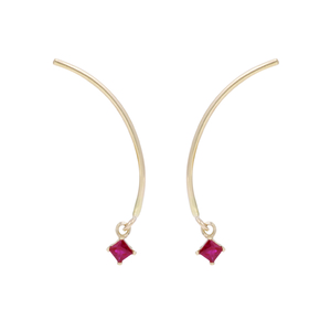 Inspired by Alexander Calder's mobile sculptures. A gentle asymmetric arc is punctuated by a hanging square ruby to create a delicate yet stunning aesthetic. - Arc measures 25mm - Available in 14k yellow gold - 2.5mm princess cut rubies - Handcrafted in NYC *Each piece is individually handmade to order - please allow 4-10 days for delivery.