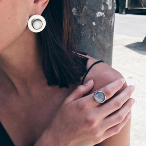 With it's flat, circular face adorned with ablack mother of pearl, the 'everett' ring combines practicality and edge.This unisex signet ring is a go-to piece with endless wearability.This circular faced ring is set with a 15x15 mm high polished black mother of pearlstone.A protection stone, brings the gentle healing power of the sea.It is a stress relieving stone; relaxing, soothing and calming to the emotions,stimulating our intuition, imagination, sensitivity and adaptability. Made in New York. Black Mother of Pearl- no two stones are alike. Available in sterling silver & yellow brass. **This ring will take 3-5 days to ship out.