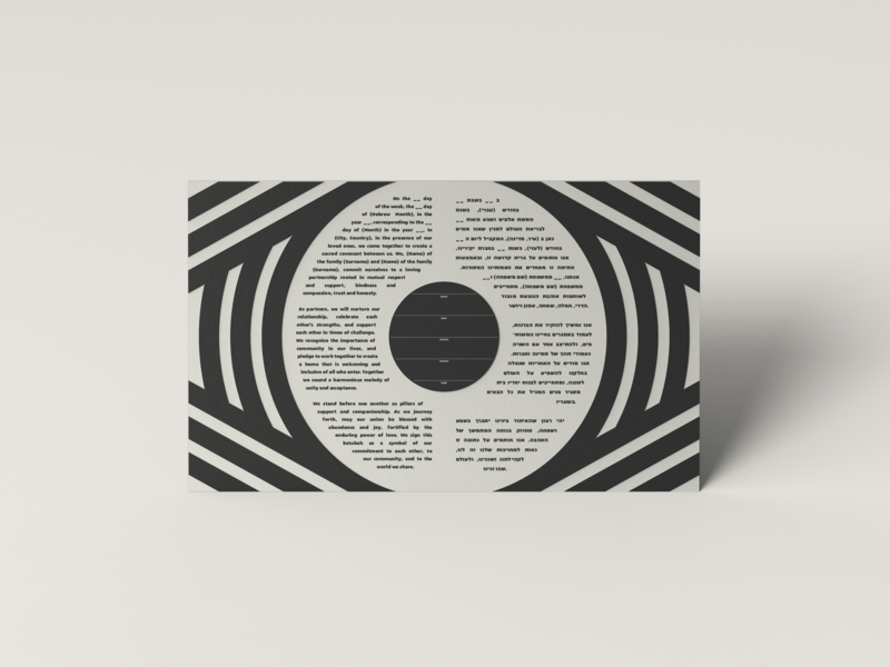 The Evilish Eye Ketubah features a bold, graphic interpretation of the ancient evil eye symbol with a modern design sensibility. Designed to serve as a focal point in a room or gallery wall, it is printed on special pearl-toned 100% rag metallic paper with silvery highlights for a luminous effect as the light shifts. This ketubah is available in three personalization options: - Fill-in-the-Blank: Select one of the standard texts, with names, date, and location filled in by hand. - Personalized: One of the standard texts with names, date, and location professionally typeset into the text. - Customized: Create your own text or modify an existing one, with all personal details professionally typeset throughout the text. After purchase, a short form is sent to collects personalization details.