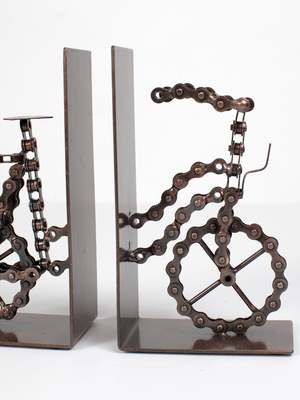 The Bicycle Chain Bookends are handmade in India from repurposed iron bicycle chains and iron sheet metal. Each set includes two pieces, with each piece measuring 4L x 2.5W x 7H inches. Handmade in India.