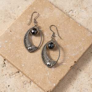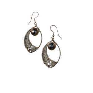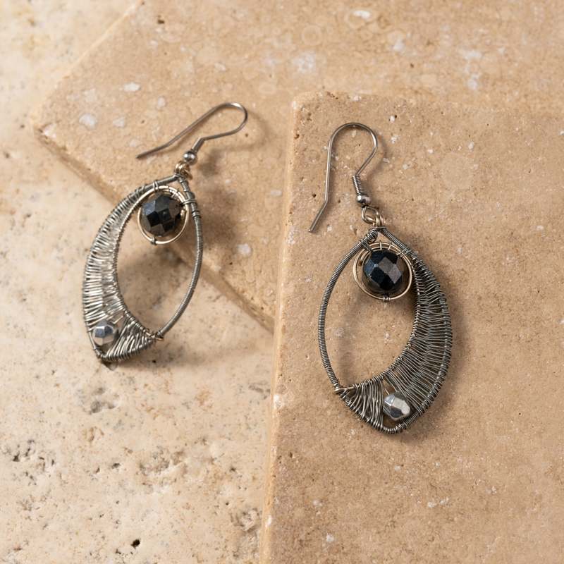 Silver-colored galvanized wire is meticulously wrapped around an elegant elliptical frame, while a central wire creates a graceful half-moon silhouette. Accented with shimmering glass beads with one nested at the base and another suspended at the top, these earrings catch the light with every movement. Finished with durable stainless steel French hooks. A Ten Thousand Villages exclusive, handcrafted in Guatemala by the artisans of Creaciones Chonita, an organization that contributes to the integral development of Guatemalan society by promoting equity and providing employment to the neediest families.