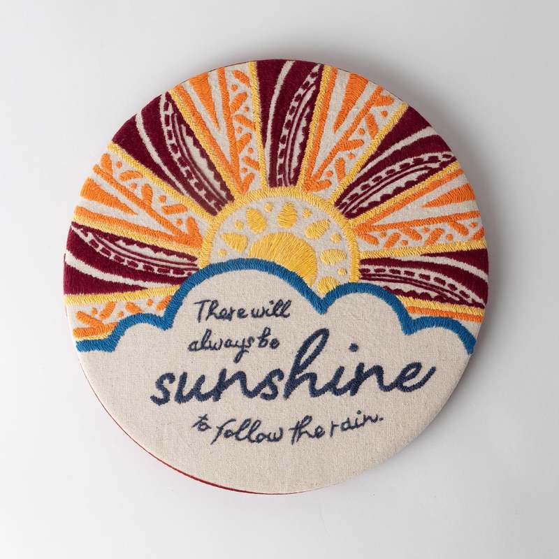 This beautiful hand-embroidered wall art features vibrant sunbeams and the outline of a cloud, serving as a hope-filled reminder that "There will always be sunshine to follow the rain." Perfect for brightening your own space or gifting to a friend or family member. Hangs by the frame on your hook. Handcrafted in Gomtipur, Ahmedabad, India by St Mary's Mahila Shikshan Kendra.
