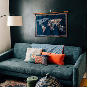 The Wonderful World Wall Hanging is hand-embroidered using the Kathiawad technique, which accents embroidery with small mirrors. Ethically handcrafted by artisans of St. Marys Mahila Shikshan Kendra in India, this piece makes a beautiful accent in your bedroom, living room, or as part of a gallery wall.