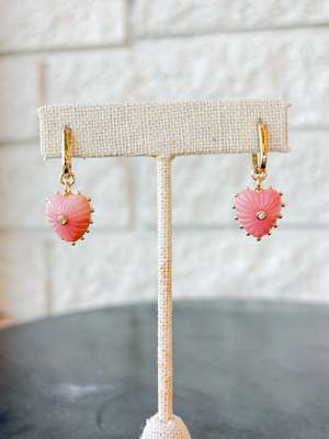 Hand-carved pink opal hearts with sparkling center stones dangling on sleek hoops. 14k gold plated, hand-carved pink opal, cubic zirconia. Length: 17 mm.