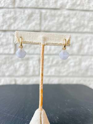 Materials: 14k gold plated, hand-carved blue lace agate, cubic zirconia. Length: 22 mm Charm dimensions: 10 mm x 11 mm x 2 mm Stone dimensions: 2 mm Weight: 4 g.