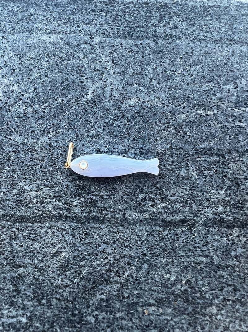 Materials: 14k gold plated, hand-carved blue lace agate with a mother of pearl eye. Charm dimensions: 35 mm x 9 mm x 5 mm. Stone dimensions: 3 mm. Weight: 3 g.