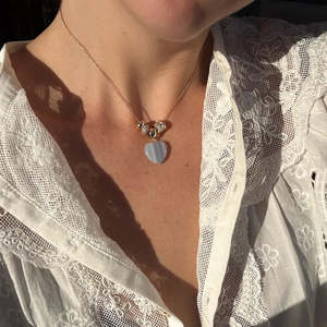 Materials: 14k gold plated, hand-carved blue lace agate. Charm dimensions: 19 mm x 17 mm x 6 mm. Weight: 4 g.