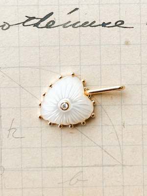 - Materials: 14k gold plated, hand-carved mother of pearl, cubic zirconia - Charm dimensions: 15 mm x 13 mm x 4.5 mm - Stone dimensions: 2 mm - Weight: <1 g