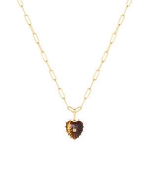 She's Malene's baby sister, a smaller hand-carved tiger's eye heart charm with a sparkling center stone. A favorite for gifting and layering. Materials: 14k gold plated, hand-carved tiger's eye, cubic zirconia Charm dimensions: 15 mm x 13 mm x 4.5 mm Stone dimensions: 2 mm Weight: <1 g Produced in China. Chain: 16-18" Vienna rolo charm chain Necklace width: 3 mm Necklace length: 16-18"