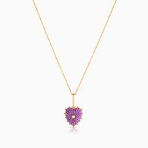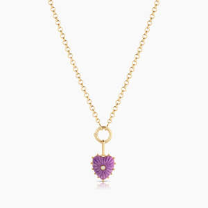 Hand-carved purple mica heart charm with a sparkling center stone. A favorite for gifting and layering. Charm only. Materials: 14k gold plated, hand-carved purple mica, cubic zirconia. Charm dimensions: 15 mm x 13 mm x 4.5 mm. CZ dimensions: 2 mm. Weight: <1 g. Produced in China. Handle with carecarved stone is delicate by nature. May vary in texture, color, shape and size. These subtle differences make each piece uniquely yours.