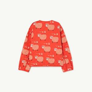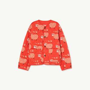 New from the Animals Observatory. Reversible puffy jacket means getting a lot of wear out of a single piece. Front side features a sweet quilted sheep print lined up against a tomato red background. The inside is a solid red with oversized white brand mark. - Boy's and girl's jacket - 100% cotton - Color: Red Sheep - Round neck - Long sleeves - Snap closure at center front and sleeves - Sleeves can be cinched or worn loose - Model is 132 cm tall (4'3") and is wearing size 8y.
