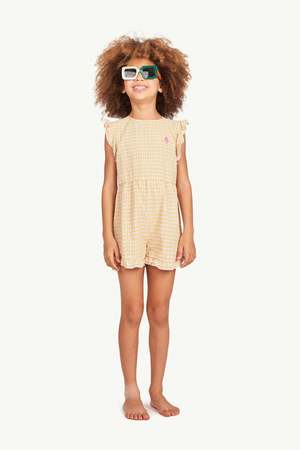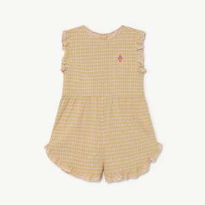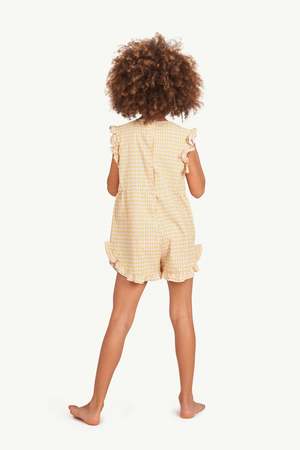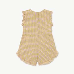 New from the Animals Observatory for Spring/Summer 2022 collectsion. Summery short jumpsuit in a retro print of tiny flowers. - Kid's romper - 100% cotton - Color: Yellow Flowers - Collarless - Sleeveless - Ruffle trim at arm holes and hem - Small red logo2 - Center back button closure - Light gathering at waist seam - Curved hem - Hits mid-thigh - Model is 131 cm tall and wearing 8y.