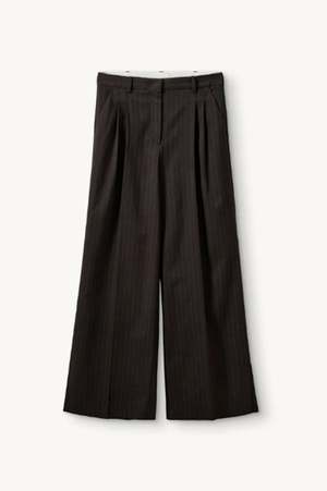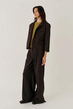 The Andora Pants by The Garment feature a mid rise with pleat detailing and a wide leg. They feature classic pinstripes for a tailored look. Color: Dark Brown Pinstripe Fabrication: Wool/Polyester Blend Fit Notes: These pants have a relaxed fit. The Garment Sizing: 4: XXS 6: XS 8: S 10: M 12: L