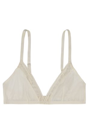 Sonata Bralette in Pearl by The Great Eros. Bralette made in our Italian matte fabric edged in our custom geometric lace for a delicate silhouette. Hook and eye closure and adjustable straps give a perfect fit. Content + Care - Solid: 75% Poly, 25% Elastane - Lace: 87% Nylon, 13% Elastane - Hand wash, Hang dry - Made in Italy Size + Fit - True to size, Model is 34B wearing a size Small - Hook and eye closure - Adjustable straps