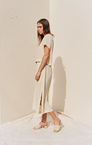 Loutro Loop Culottes in Ecru by The Great Eros. With button and loop detailing along each leg, this culotte can be worn closed or open for an airy extra wide-leg. Content + Care - 100% Silk - Dry Clean or Hand wash, Hang dry - Imported Size + Fit - Adjustable drawstring waist - True to size. Model is 5'9" and wearing a size Small