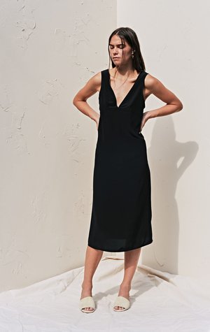 Loutro Easy Slip Dress in Black by The Great Eros. This mid-length silk slip dress features a plunging neckline and adjustable button straps. Content + Care - 100% Silk - Dry Clean or Hand wash and lay flat to dry - Imported Size + Fit - Adjustable straps - Fits small in the hip - Model is 5'9" and wearing a size Small
