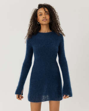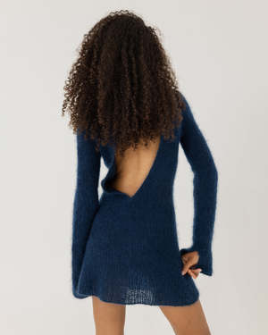 The Eglut Dress by The Knotty Ones is hand-knitted using a 3D circular technique for a seamless, form-hugging silhouette. Made from RMS-certified silk-mohair (30% Silk, 70% Mohair), each dress takes up to 60 hours for an artisan to complete. Features include a round neckline, dramatic open back, elongated sleeves with split cuffs, and a skirt with subtle transparency for a sophisticated look. Produced in small batches by female artisans in rural Lithuania. Each dress is made with a single thread for minimal waste. The silk-mohair blend creates a soft, voluminous texture that is both luxurious and durable.