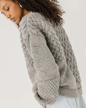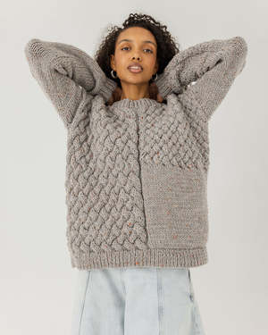The Heartbreaker Sweater by The Knotty Ones is inspired by past relationships and designed by co-founders Sandra, Danut, and Akvil. Each pattern represents a different romantic relationship, all tied together in a comfortingly chunky blend of wool and alpaca. Hand-knitted by female artisans in rural Lithuania using traditional Baltic techniques, each sweater takes between four and five days to produce. No two pieces are ever exactly the same. Features a relaxed, oversized fit with ribbed trim and heavyweight knit fabric. Made from 35% Alpaca and 65% Wool using only 100% natural yarnsoft, cruelty-free, and free from microplastics or harmful chemicals. Care: Dry clean or hand wash. Store folded. Pro tip from knitter Aldona: Size down unless you prefer a much looser fit; otherwise pick your usual size.