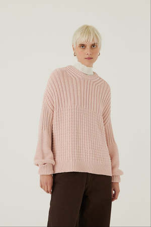 "Delia" means "half-moon" in Lithuanian, with the half-and-half stitching in this sweater mirroring the changing cycles of the moon. Made slowly in Lithuania with heritage craftsmanship, the Delia sweater is meant to be worn running across empty beaches or through pine forests. It features a unisex boxy fit, cuffed sleeves, and drop shoulders, and is made from 100% Fair Trade, OEKO-TEX cotton. MATERIALS & CARE 100% Fair Trade, OEKO-TEX cotton Store folded Dry clean or hand wash in cold water Dry flat SIZE & FIT Delia is oversized in width but not length to work on different shapes. S: Width 24.8" Length 22.4" M: Width 24.8" Length 22.8" L: Width 24.8" Length 23"