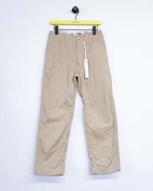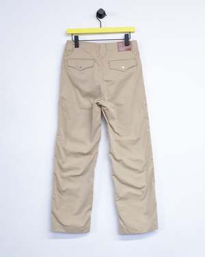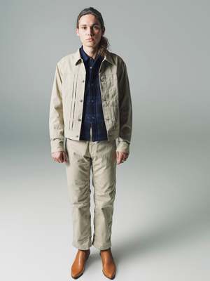 Western work pants made of in a Burberry style cotton gabardine cloth. The silhouette is deep in the crotch and loose, with The Letters LOGO dot buttons on the cutting of the front pockets, and the work pants use western details in various places such as belt loops. The material is a high-density woven cotton gabardine so-called "Burberry" cloth. After weaving, it is washer-finished to bring out the natural texture from the beginning, and then tumbled-dried to finish. Model wears a Size M