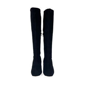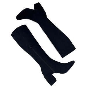 - Knee high booties are all the rage and you can't go wrong with this one - Fitted knee high boot hits below the knee with a block heel - Stretch suede upper | Rubber sole - Heel Height: 2.75" - Shaft: 13.75" - Fit runs true to size