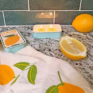 Freshen up your space with this Lemon & Oyster Candle Set of 2. The Lemon Candle fills the room with a fresh, vibrant aroma of sweet lemons, while the Oyster Candle evokes a sunny afternoon on the coast with notes of salty coastal air. Each all-natural soy candle sits in a reusable sardine-tin-style container and features a double wick for a clean, even burn for up to 24 hours. Set includes: 1 Lemon Candle + 1 Oyster Candle Two 4 oz. sardine-style rectangle tins Approximately 24-hour burn time per candle 100% natural soy wax Custom blended, paraben- and phthalate-free fragrance oils Two lead-free cotton wicks for a clean, even burn Sliding lid stores neatly under the candle when lit Measures 4" x 2.5" x 7/8" Hand-poured locally in Washington, DC by District Candle Lab