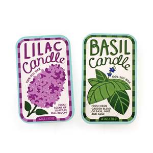 Fresh, floral, and herbaceous, this Lilac & Basil Candle Set of 2 brings the feeling of a blooming garden indoors. Soft, powdery lilac pairs with the crisp, green scent of freshly picked basil for a scented candle duo that feels both calming and refreshing. Each all-natural soy candle sits in a reusable sardine-tin-style container and features a double wick for a clean, even burn for up to 24 hours. Set includes: 1 Lilac Candle + 1 Basil Candle Two 4 oz. sardine-style rectangle tins Approximately 24-hour burn time per candle 100% natural soy wax Custom blended, paraben- and phthalate-free fragrance oils Two lead-free cotton wicks for a clean, even burn Sliding lid stores neatly under the candle when lit Measures 4" x 2.5" x 7/8" Hand-poured locally in Washington, DC by District Candle Lab