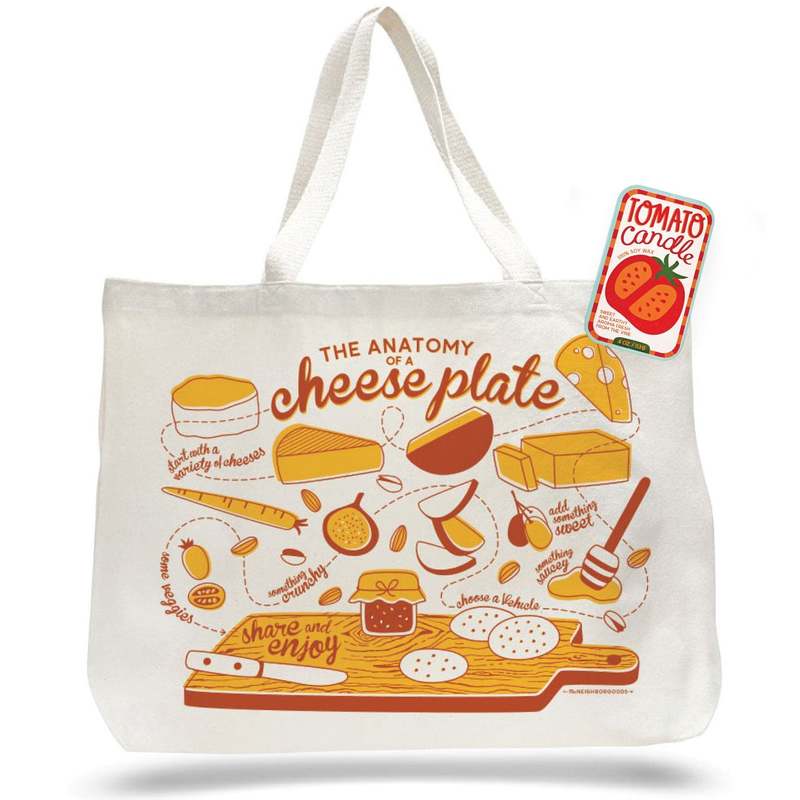 Our Tomato Candle & Cheese Tote Set pairs two home essentials a hand-poured soy candle and a cotton canvas tote into one giftable set. Tote your farmers market hauls in this oversized Cheese Tote, then come home and fill your space with the sweet, earthy aroma of tomatoes straight from the vine with our Tomato Candle. Together, they make a perfect hostess gift, housewarming present, or anytime treat for someone you appreciate. Set includes: 1 Tomato Soy Candle + 1 Cheese Canvas Tote Bag All-Natural Soy Candle 4 oz. sardine-style rectangle tin Approximately 24-hour burn time 100% natural soy wax Custom blended, paraben- and phthalate-free fragrance oils Two lead-free cotton wicks for a clean, even burn Sliding lid stores neatly under the candle when lit Measures 4" x 2.5" x 7/8" Hand-poured locally in Washington, DC by District Candle Lab Canvas Tote Bag Measures 20"W x 15"H x 5"D with gusseted bottom and 20" handles 100% cotton heavy canvas with reinforced stress points Larger than a standard tote built for farmers market hauls and grocery runs Designed, printed, and packaged in the USA