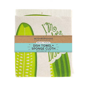This set includes one dish towel and one Swedish sponge cloth. Towel: Measures approximately 24" x 26" (size tolerance 2-3") Made from all natural, unbleached 100% cotton Machine washable Hand screen-printed with eco-friendly inks Sponge Cloth: Measures 6.8 x 7.75 Made of 100% biodegradable material Hole on top for easy hanging by the sink Screen printed with water-based, eco-friendly ink Can be cleaned in dishwasher or washing machine Soft and pliable when wet, dries quickly between uses