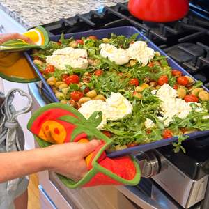 The Tomato Tea Towel and Pot Holder Set includes two kitchen essentials: a screen-printed cotton tea towel and a shaped pot holder designed for everyday cooking and baking. The absorbent tea towel can be used to dry dishes, wipe counters, or line a bread basket. The pot holder is designed to help handle hot cookware safely and features a built-in pocket for added grip and heat protection. Set includes: 1 Tomato Tea Towel 1 Tomato Pot Holder Tea Towel 100% unbleached cotton Hand screen-printed with eco-friendly, water-based inks Machine washable Dimensions: 24" W x 26" L Pot Holder Measures approx. 9.75" x 7.75" 100% cotton outer with inner fill made from recycled plastic fibers Machine washable; hang dry Printed in the USA; hand packaged and designed in Washington, DC.