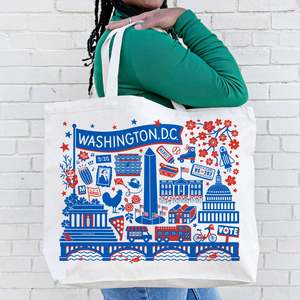 The DC Landmarks Tote Bag is a celebration of everything we love about our nation's capital. It is bigger than your average tote bag and works for farmers market hauls, shopping trips, and showing off your DC pride. A perfect gift for a DC native, friend, or to remember your visit to our city. Measures 20"W x 15"H x 5"D with gusseted bottom (20" handles) 100% cotton Heavy canvas with reinforced stress points to keep from ripping Designed, printed + packaged in the USA Color may vary slightly from monitor to monitor.