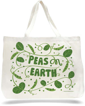 The Peas on Earth Tote Bag by The Neighborgoods is larger than your average tote and ideal for farmers market hauls, shopping trips, or as a gift bag. Measures 20"W x 15"H x 5"D with gusseted bottom (20" handles) 100% cotton canvas Heavy canvas with reinforced stress points to prevent ripping Designed, printed, and packaged in the USA Includes hang tag for packaging