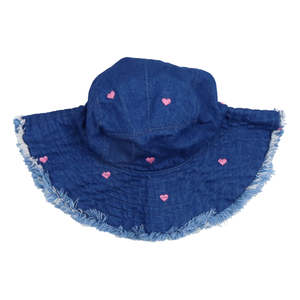 Denim bucket hat with frayed edges and all-over embroidered hearts. 100% BCI Cotton. Hand wash only. Style code: S26AHB1P610.