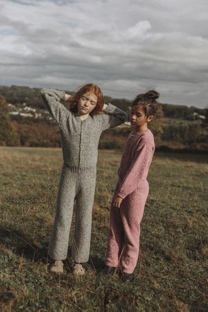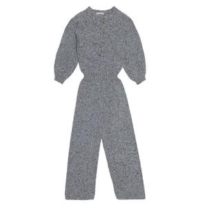 Knit kid's jumpsuit in a grey melange wool blend. - From The New Society Autumn/Winter 2019 'Heritage' collectsion - Girl's pantsuit - 60% wool, 20% viscose, 20% polyamide - Color: Grey Melange - Long, full sleeves - Rounded neckline - Button placket - Elasticized waistband and cuffs - Ribbed finishing at collar, cuffs, and waist - Full length