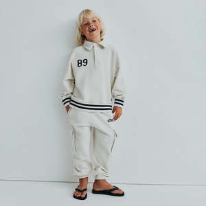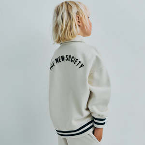 Fleece polo sweatshirt for children with timeless styling and soft comfort. - Fleece sweatshirt - Polo collar with button closure down the front - "89" applique on the chest - "The New Society" applique across the back - Ribbed knit striped cuffs and hem - Long sleeves 100% Cotton Machine wash 30 delicate. Style code: S26AHB1P531 Type: Sweaters
