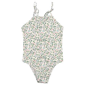 The New Society, founded in Spain in 2018 by Estefana Grando, blends timeless aesthetics with sustainability. Originally a kids' fashion brand, it has expanded to include womenswear while maintaining a commitment to emotion-driven design and a conscious future in fashion. - One-piece swimsuit - All-over jasmine floral print - Straps that tie at the shoulder 84% Recycled Polyester, 16% Elastane Machine wash 40. Do not bleach or tumble dry.