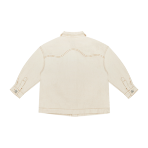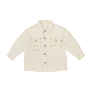 New from the New Society for Spring/Summer 2022 collectsion. An ideal spring layer, this raw, undyed denim overshirt features mustard contrast seaming, front flap pockets, and button front. - Unisex kid's shirt jacket - 50% cotton 25% organic cotton 25% recycled cotton - Color: Vanilla - Point collar - Long sleeves with button fastening at cuffs - Plastron chest pockets - Center front button closure - Contrast seams throughout - Oversized fit