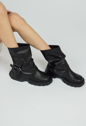 Black Ankle Boot with Buckle Detail Adjustable Buckle Treaded Sole Soft Vegan Leather Very comfortable Shipping could take 7-14 days. Heel: 2in / 5.08cm Shaft Height: 8in / 20.32cm Shaft Circumference: 18.85in / 47.87cm