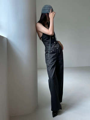 Wide leg pants with a double waistband, zipper and button fastening, side and back pockets, and belt loops. Made from 100% cotton black denim.