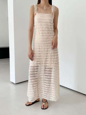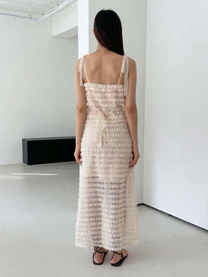 The Casey Dress features lace straps, a sheer textured overlay, tie at waist, elastic at bust, side zipper, and is half lined. Made from 100% polyester. Measurements: Bust: 26in / 66cm Length: 55in / 139cm