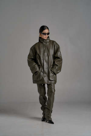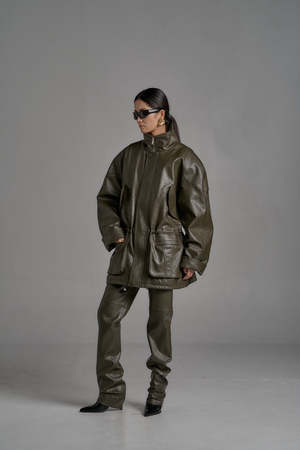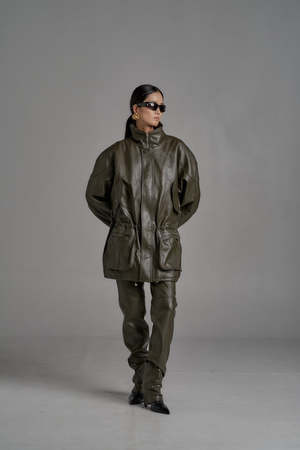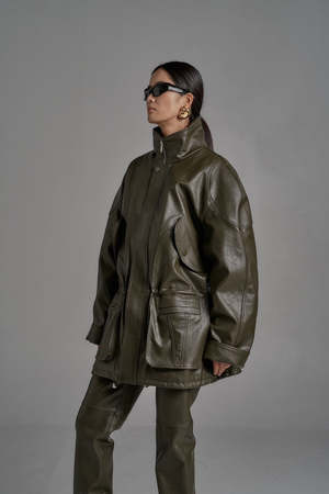 One size (fits XS-L). Color: Olive Zipper and button fastening. Oversized fit with cuffed sleeves and adjustable cinched details. Multiple pockets. 50% Polyurethane, 50% Rayon. Dry clean only. Product measurements: Width: 122cm / 48in Length: 58cm / 23in