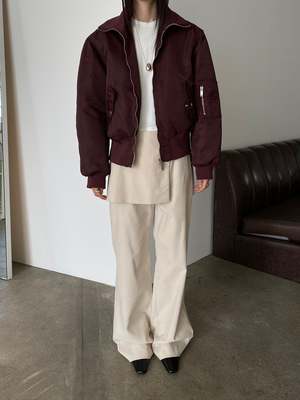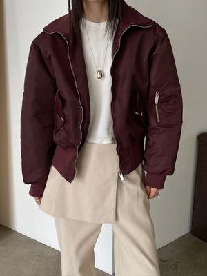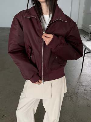 The Linden Bomber features an optional high collar, double zipper, front pockets, utility pocket on the sleeve, and puffed material. Made from 75% nylon and 25% polyester. Color: Burgundy. One size fits XS-L.