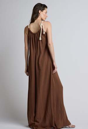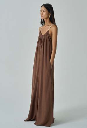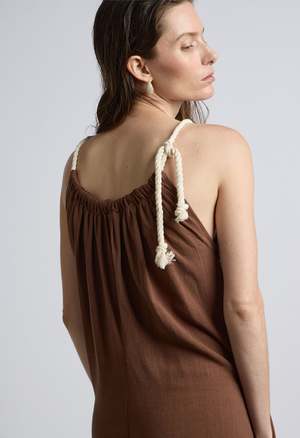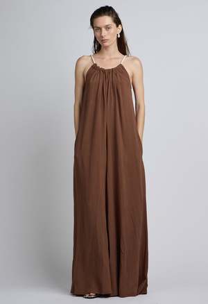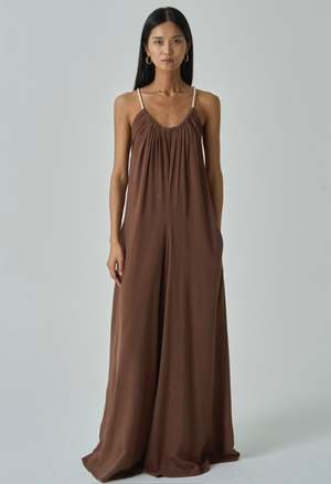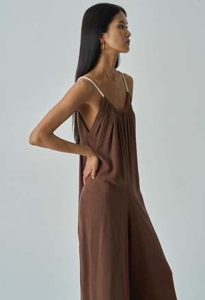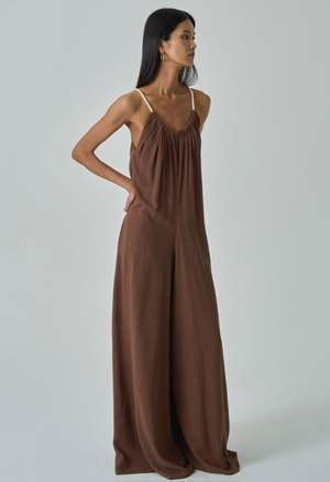 One Size. Fits XS-L Color: Chocolate Oversized Fit Jumpsuit Two side pockets Invisible Side Zipper Rope Neckline 70% Rayon 30% Linen Dry clean only By The NKC Store Product Measurements: Bust: 91.44cm / 36in Inseam: 73.66cm / 29in Model is wearing size O/S