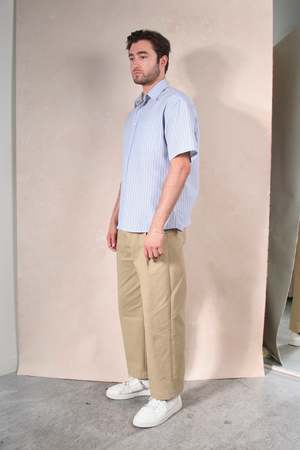 The Eddie Short Sleeve Button Down Shirt features a collared neckline, front pocket, and button-up front. Made from lightweight, textured 100% cotton material, it offers a comfortable fit for sizes XS to L. The shirt measures 48 inches at the chest and 30 inches in length. Color: Blue Stripe.