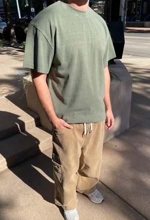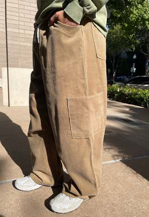 One size: XS-XL Color: Khaki Corduroy cargos with drawstring at waist, stacked side pockets, elastic waistband, front and back pockets, belt loops, and a baggy fit. 100% Cotton.