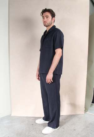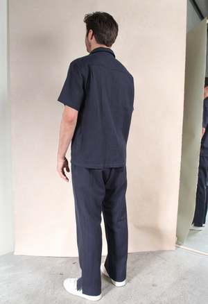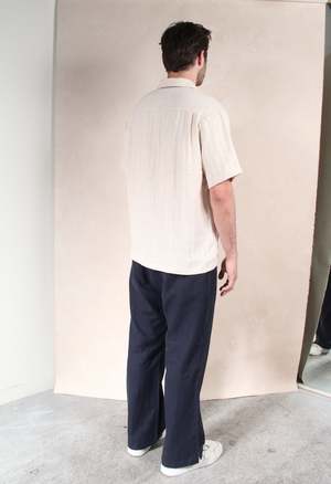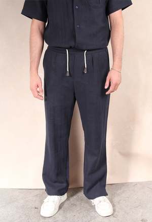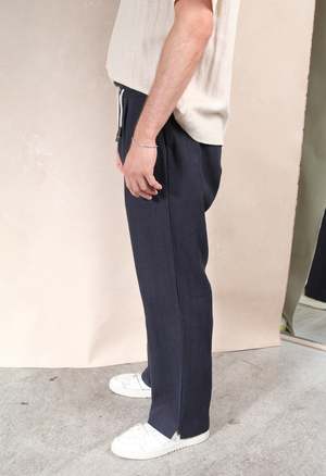 One Size: XS-L Elastic waistband with adjustable drawstring 2 side pockets and 1 back pocket 85% Linen 15% Cotton Measurements: Waist: 26in Length: 42in