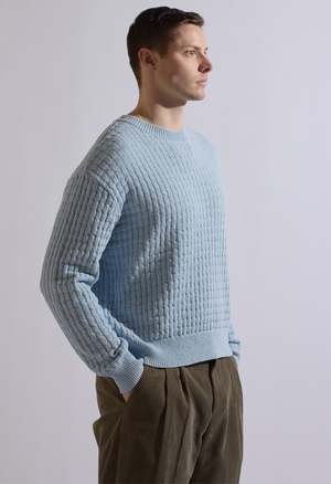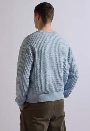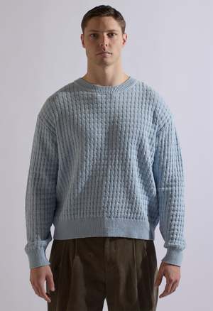 One size. Fits S-L Color: Blue Cable Knit Sweater 100% Cotton Dry Clean Product Measurements: Width: 52in Length: 26in