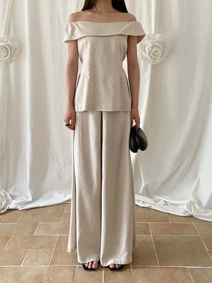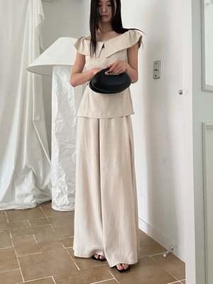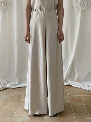 One size fits XS/S. Color: Beige Wide-leg trousers with an elastic waistband, pleat detail, high waist, and side zipper closure. 70% Polyester, 30% Linen Measurements: Waist: 24in / 61cm Inseam: 28in / 71cm