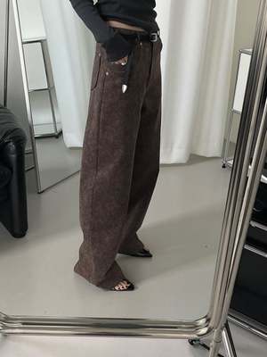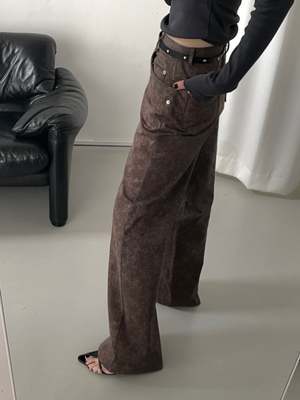 Wide leg pants with zipper and button fastening, side and back pockets, belt loops, and printed fabric. Made from 100% cotton.
