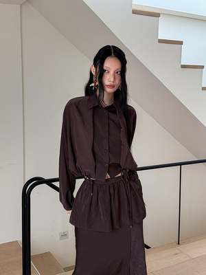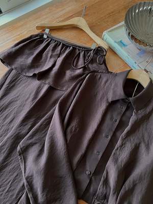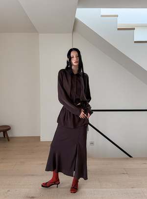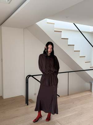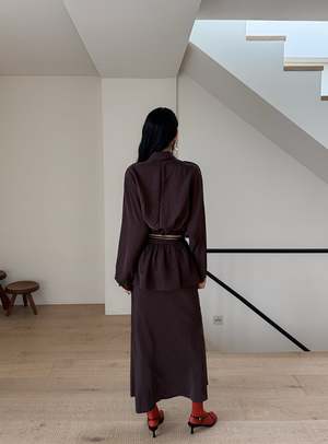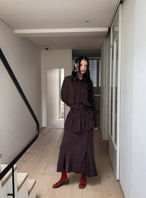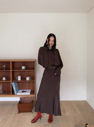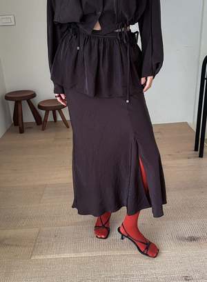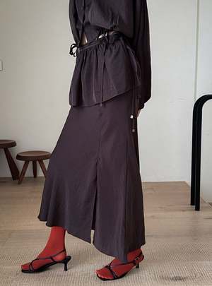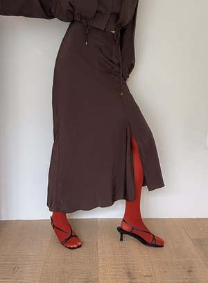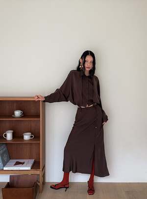 One size fits XS-M. Color: Brown This 2-piece skirt set features a midi skirt with a wrap mini skirt detail, flared fit, side slit, and back zipper. Fabric: 58% Polyester, 42% Rayon. Measurements: Waist: 26in / 66cm Length: 36in / 91cm